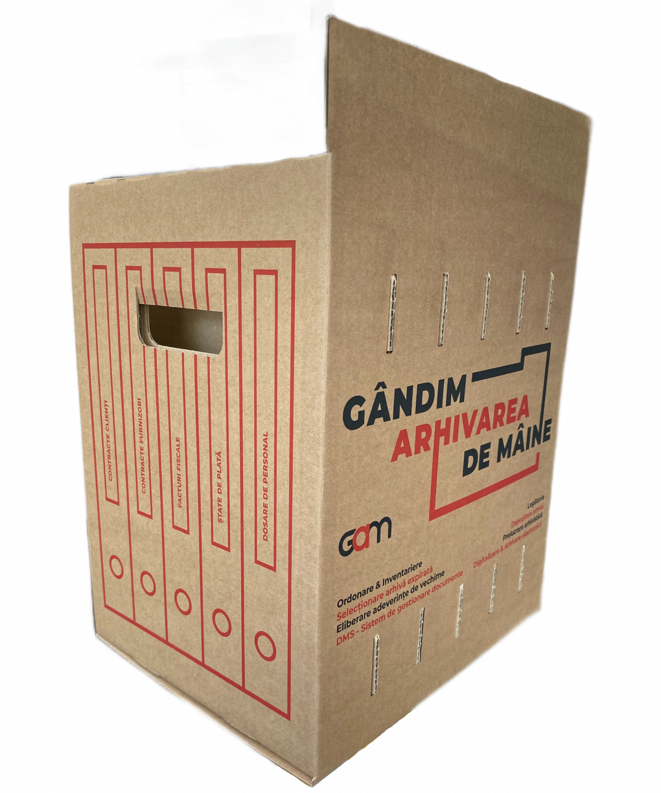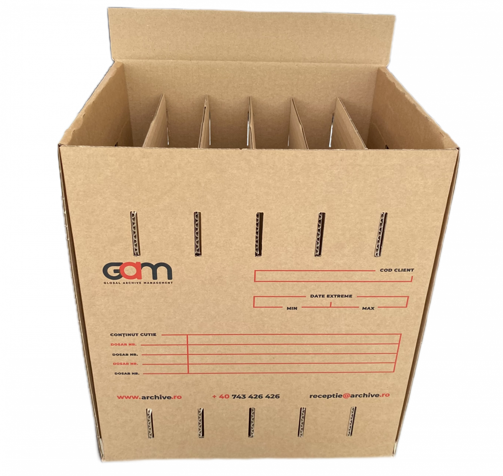 Alegând cutia tip 406, beneficiați de un raport calitate-preț avantajos și va mențineți arhiva organizată datorită datelor tipărite pe laturile cutiei. (Client, date extreme, conținut cutie)